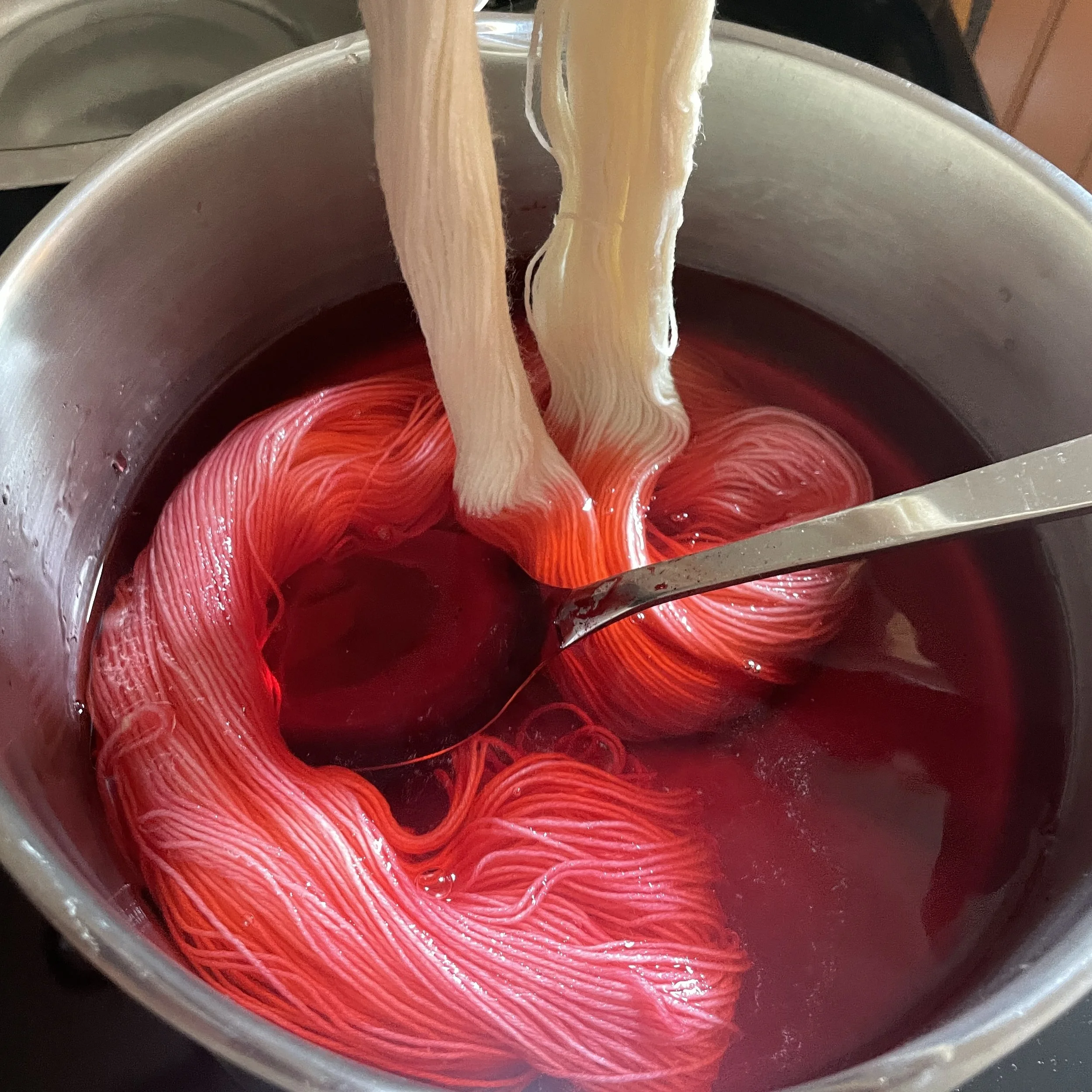 6. Heat the dye bath (and the skein) and simmer until the water is mostly clear (don’t worry if there’s still a bit of dye left over in the dye bath). Want more color? Squeeze out the skein, pour the contents of the second packet into the dye bath, and repeat. OR, you can save some of the dye to add speckles, to mix and match with other kits, etc. *